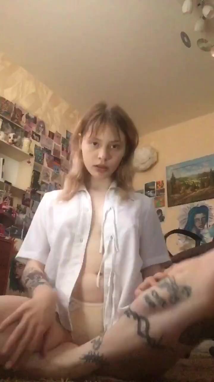 A blonde with a tattoo undresses on camera. Do you want to continue?
